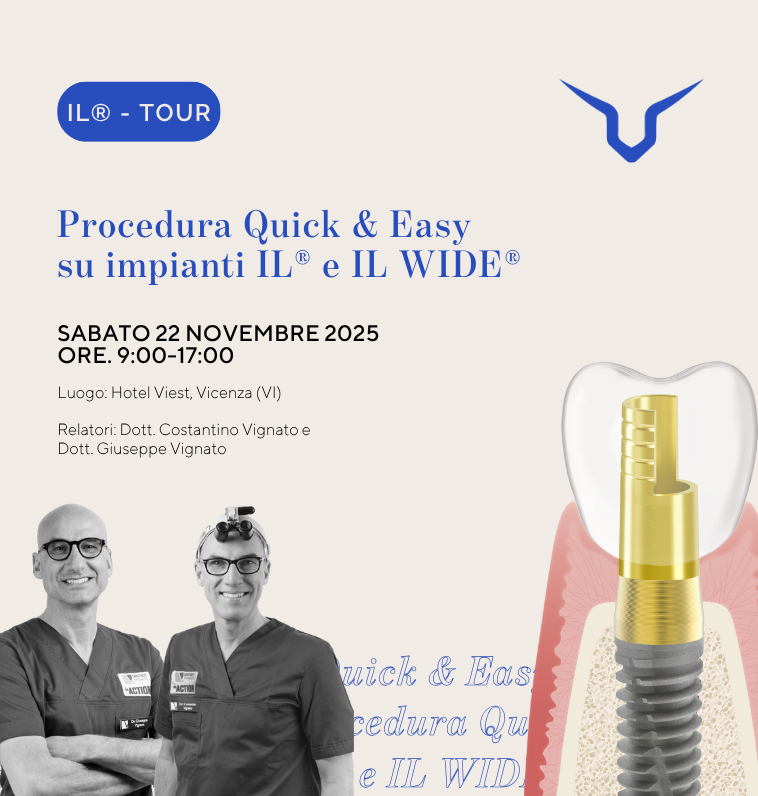 L’evento sarà condotto dai Dottori Costantino e Giuseppe Vignato, i quali guideranno i partecipanti in un percorso teorico di full immersion volto all’analisi e all’applicazione clinica del sistema implantare IL® e IL WIDE®.